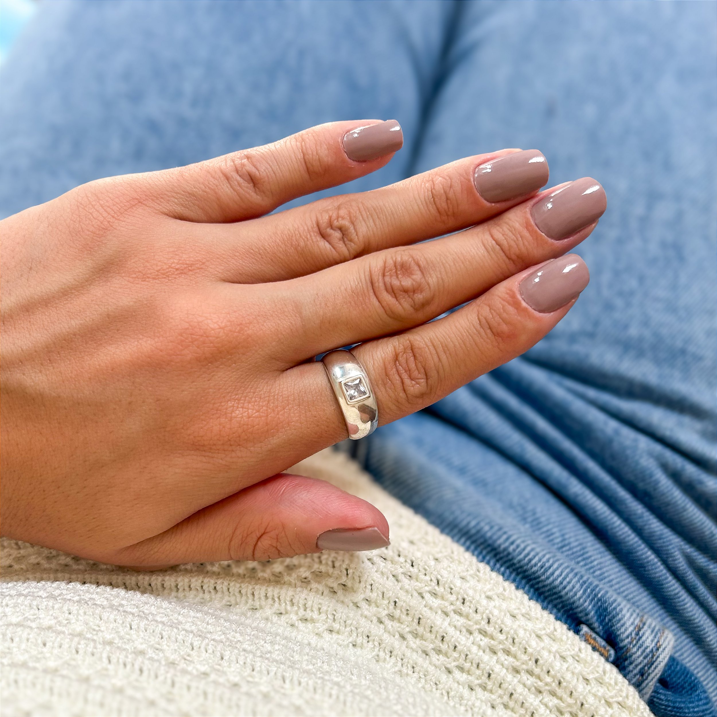 Nosso Anel Giu robusto com cravação central une a força do design moderno com o brilho delicado do cristal. Perfeito para quem busca presença e sofisticação em um único acessório.
