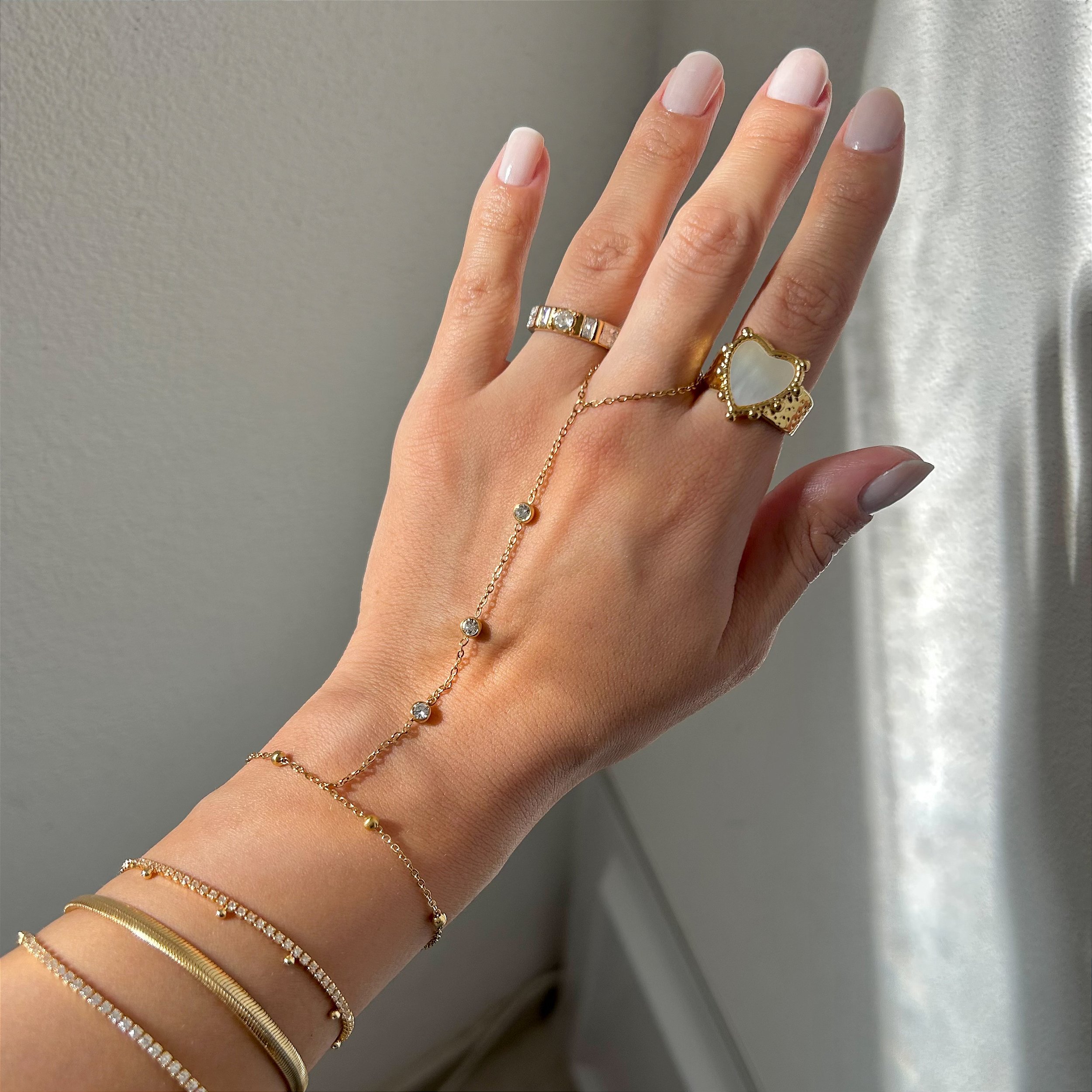 Combine a delicadeza da hand chain com outros acessórios da ALYA!