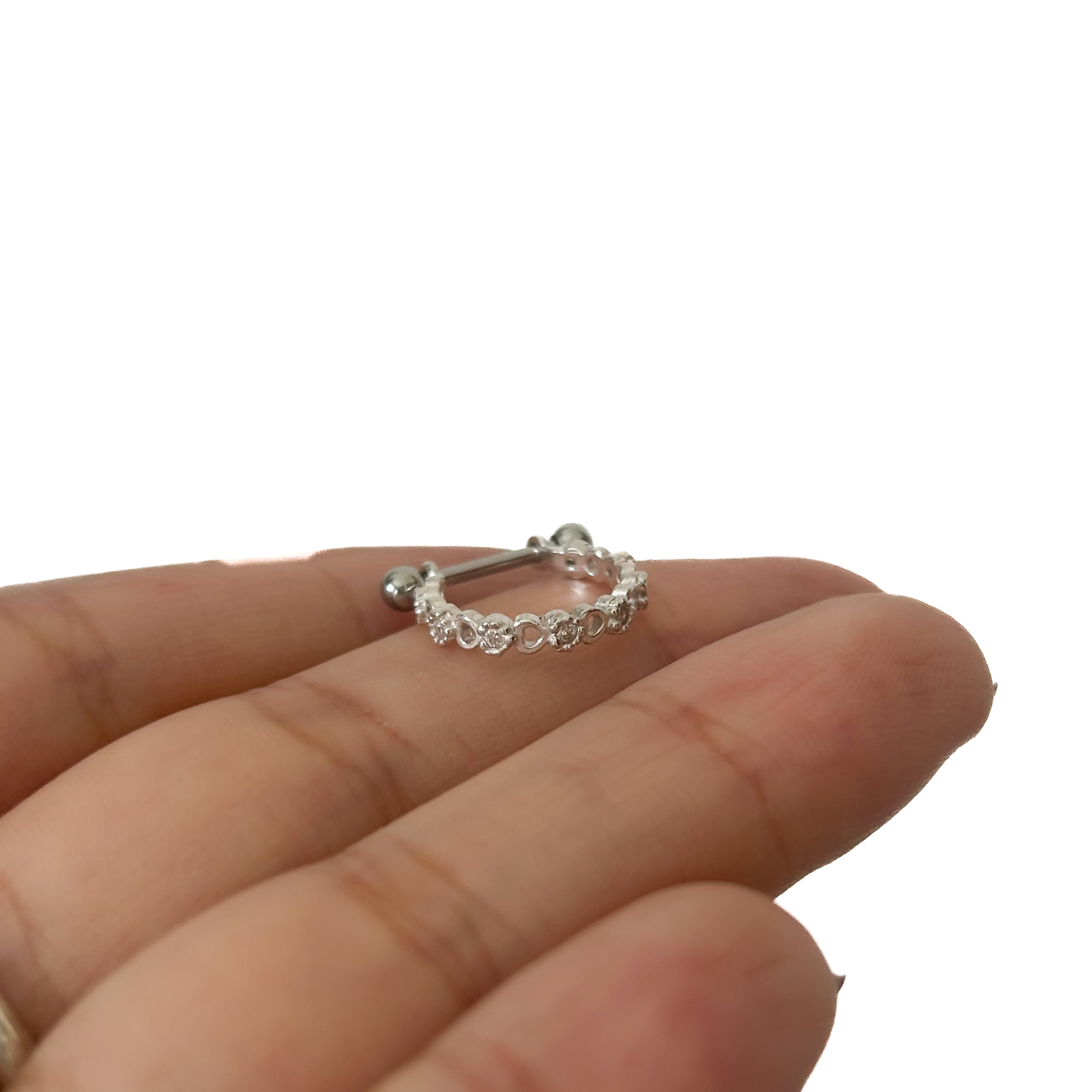 Este piercing apresenta uma sequência encantadora de corações vazados, intercalados com pontos de luzem zircônia.